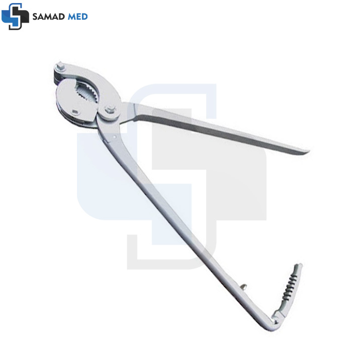 Serra Emasculator used in large animal castration, specifically designed for crushing and cutting the spermatic cord. It minimizes blood loss and trauma during the procedure by simultaneously crushing the blood vessels and cutting the cord.